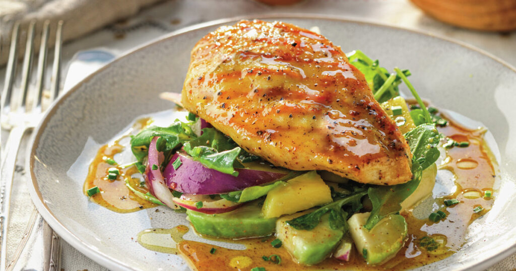 ¡Prepárate para disfrutar de una explosión de sabores con esta deliciosa receta de Pollo a la Parrilla con Salsa de Mango y Aguacate!
