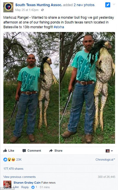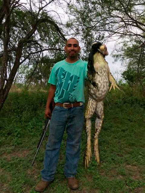 La Asociación de Caza del Sur de Texas compartió las imágenes en su página de Facebook con la leyenda: “Markcuz Rangel – Quiso compartir una rana toro monstruo que cazó ayer por la tarde en uno de nuestros estanques de pesca en un rancho al sur de Texas, ubicado en Batesville Tx rana monstruo de 13 libras!!! #stxha”.