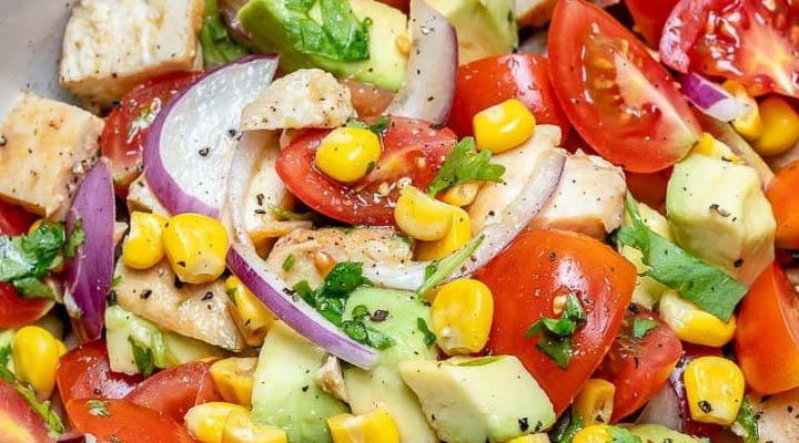 - En un recipiente grande vierte los cubos de pollo, los tomates, el aguacate, la cebolla, el cilantro y el maíz.