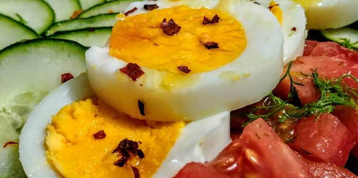 Cena: Revuelto de huevo con champiñones y queso rallado y ensalada tibia de verduras al vapor.