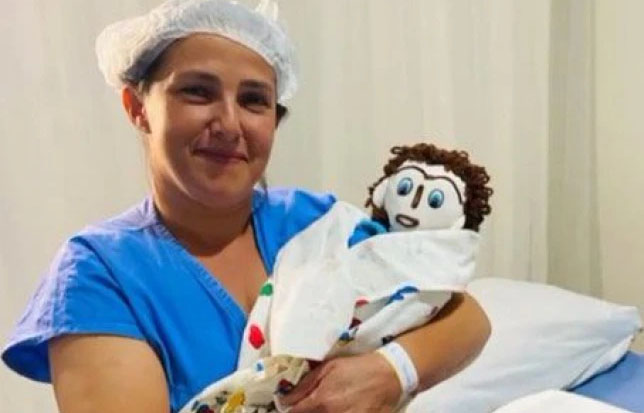 Ella dijo que «dio a luz» a una nueva muñeca de trapo en un trabajo de parto de 35 minutos en casa, con un médico y una enfermera presentes. Ella dijo que era sin dolor.