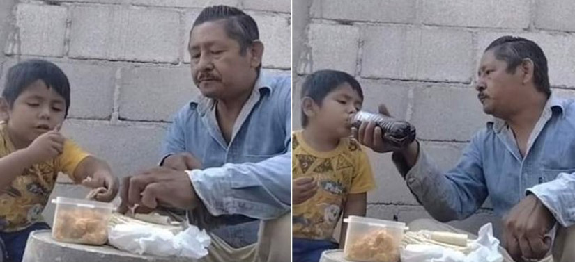 Una Lección de Vida: Esta imagen no solo muestra la simplicidad de su comida, sino también el vínculo especial entre el padre y el hijo. La escena refleja el amor, el sacrificio y la felicidad que se pueden encontrar en los momentos más humildes de la vida.