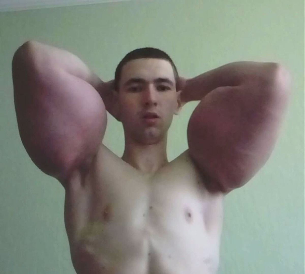 El joven lleva casi un mes publicando fotos de sus bíceps y tríceps, los cuales aumentan día a día, producto del consumo de Synthol inyectable, un aceite que sobrevuela en el ambiente del culturismo.