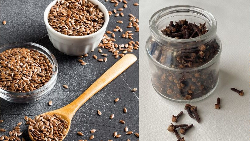 Muele el clavo de olor y las semillas de linaza en un molino para café o en un molcajete hasta obtener un polvo fino. Puedes tomarlo espolvorado en tu comida, o simplemente tomarlo con un vaso de agua tibia, de preferencia en ayunas.