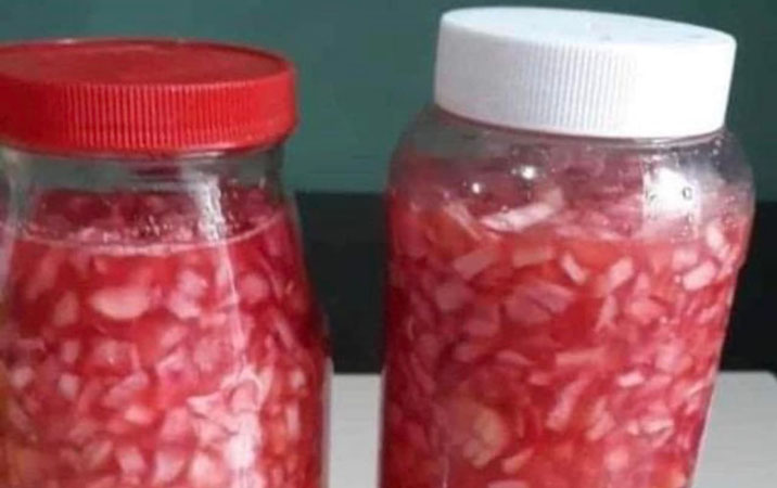 1 cebolla roja, 1/2 cabeza de ajo, 5 cm de jengibre y el zumo de 10 limones, rayas todo y aplicas el zumo. Si tienes miel pura la mezclas sino es preferible así.