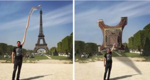 Pidió ayuda para que pongan la torre Eifell bajo su mano,...